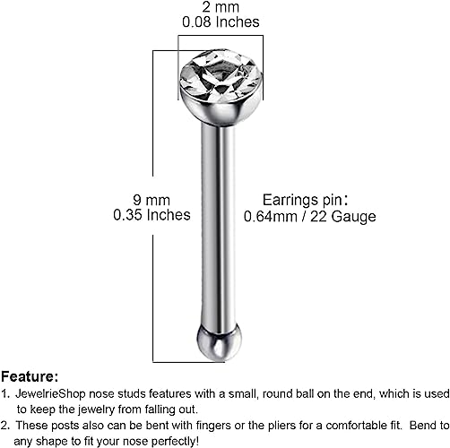 REGULAR SIZE: About 9mm / 0.35 inch Length; Pin Thickness: 0.64mm / 22 Gauge, 2mm Top Crystal. Cool Size for Your Nose and Easy to Put On, Shiny Crystals Make Your Nose More Sexy and Attractive. Our stainless steel nose bone is also bendable and flexible. The bendable pin is about 7mm long. These posts can be bent with fingers or the pliers for a comfortable fit. Bend to any shape to fit your nose perfectly!